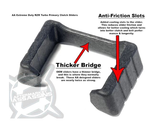 - This kit includes our complete heavy duty AA primary clutch. This clutch is the same design found on the 2016-2020 RZR Turbo models with an encapsulated tower design. We found this clutch to hold power better, hold up better (no exploding), and slip the belt less. It simply meets the demands of these high horsepower vehicles, and is proven. This clutch also holds belt grip better than billet clutches, especially at higher RPM. This primary clutch is our own version made with higher grade tool steel for the post, assembled with AA HD sliders, to our AA specifications.