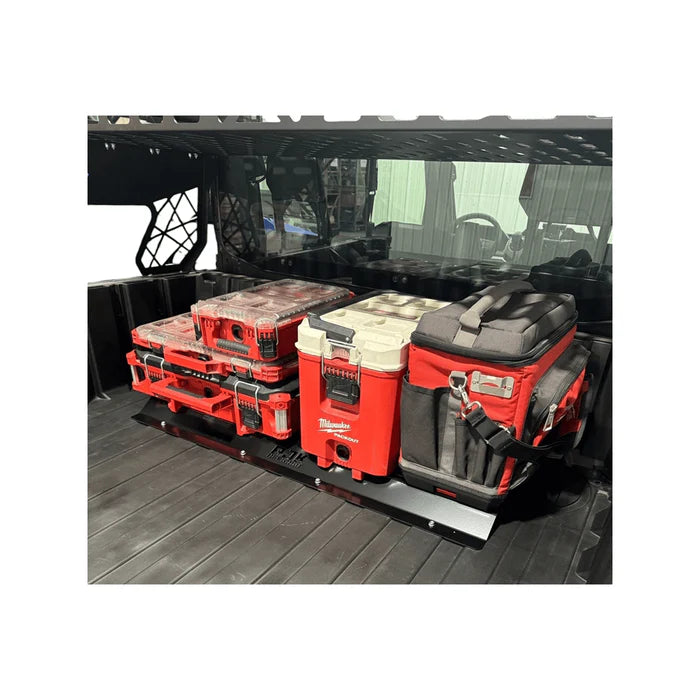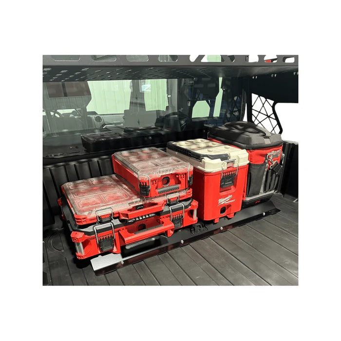 20585Our Milwaukee Packout Mount is the perfect storage solution for your Polaris Ranger 1500XD. This is our front mount and mounts towards the front of your bed close to the cab. This mount uses existing mounting holes along with four self drilling screws. This is a very simple install. Simply remove two bed bolts and replace them with the supplied bolts, then use the four supplied self drilling screws and fasten the rear of the mount to the bed. We CNC Laser cut our Milwaukee Packout Mount in house from 10 gauge P.O. steel then powder coat it black.