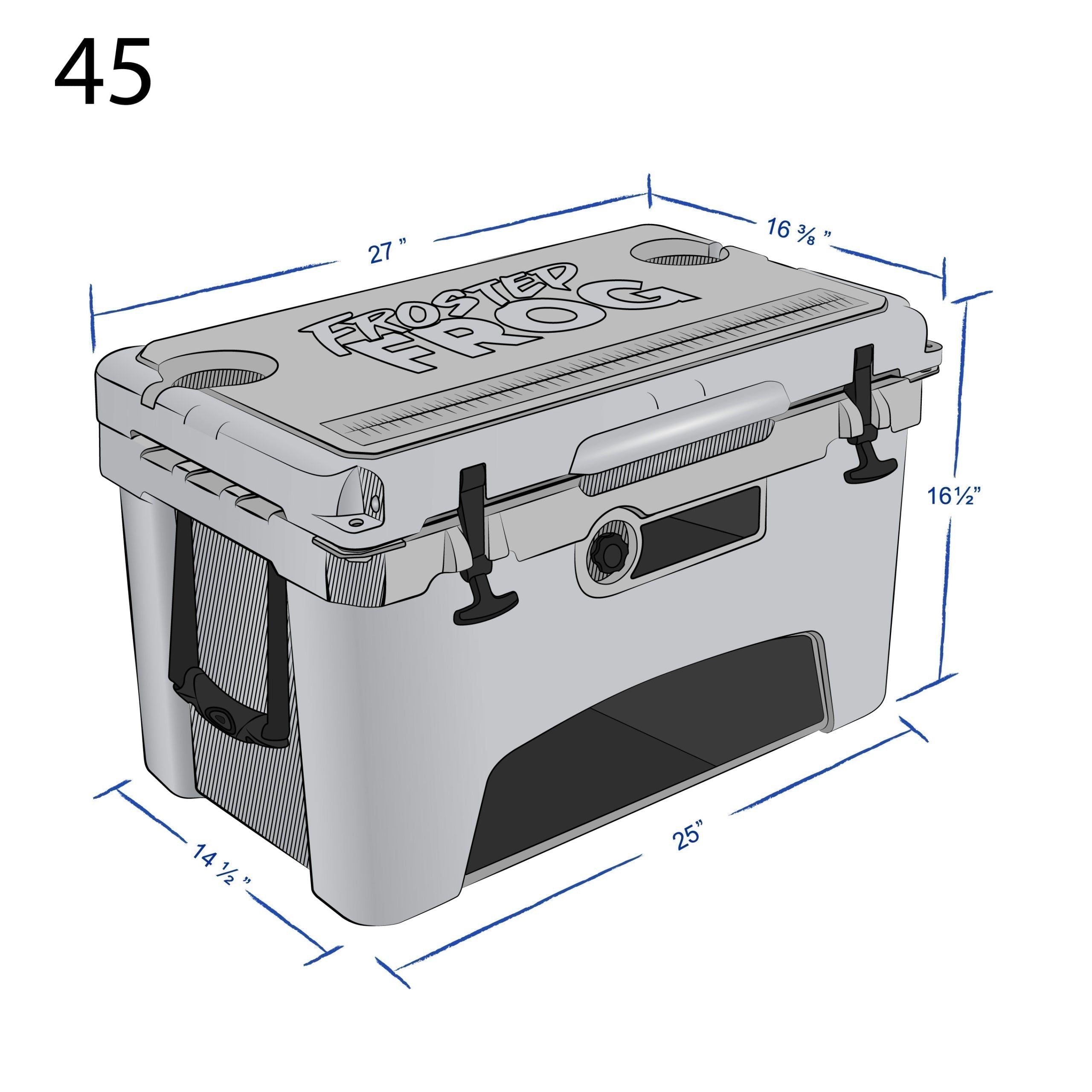 Frosted Frog 45qt camo cooler is high quality rotomolded with extra-thick walls for superior insulation. Manufactured with high density multi compound PU Foam walls and an environmentally friendly pressure-injected insulation system. Heavy duty rubber latches and non-slip, non-marking bottoms on all four corners. Commercial grade door lid seal gasket. All materials used are non-toxic and FDA approved.