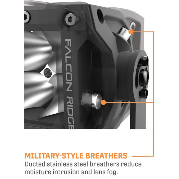 With industry leading features like IP68 rated housing, 304 Stainless Steel hardware, heavy-duty mounting brackets and shatter resistant lenses, the Falcon Ridge Summit Series LED lights are ready for whatever conditions arise. Falcon Ridge takes it to the next level with the Airstrike Intake and military-style breathers to help the lights maintain optimal operating temperatures. The IP67 rated backlit switch with solid aluminum housing fits standard knockouts, so it will seamlessly integrate into your dash control panel.