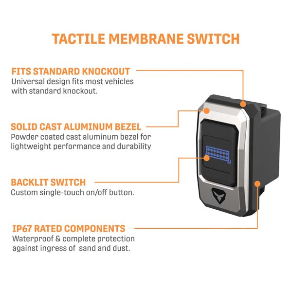 - Backlit Tactile Membrane Switch — Universal design fits most vehicles with standard knockout.