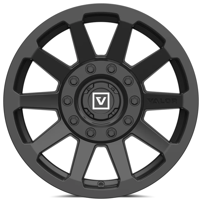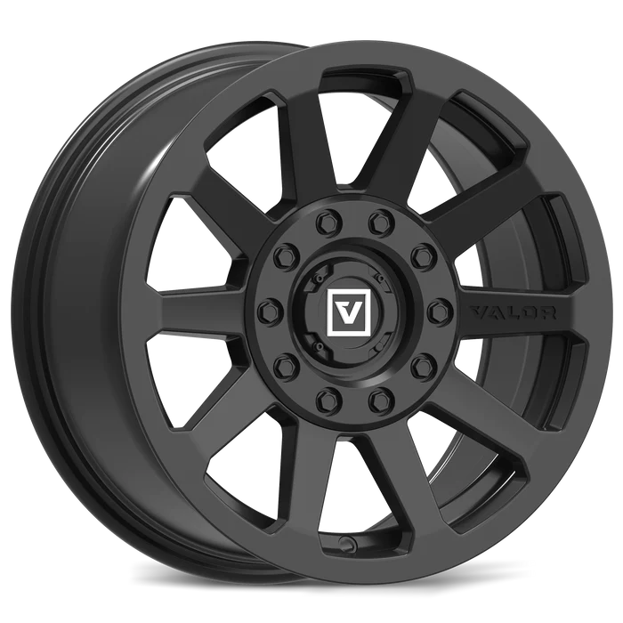 The V02 is manufactured using only A356 aluminum with T6 heat treatment for one super strong wheel. Super clean ten spoke design with debossed VALOR logo. Offroad inspired and reinforced inner lip. Engineered to exceed SAE 2530 safety specifications. Bolt-on shorty center cap with embossed white logo.