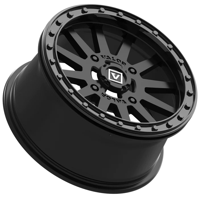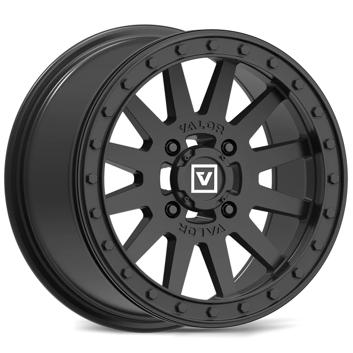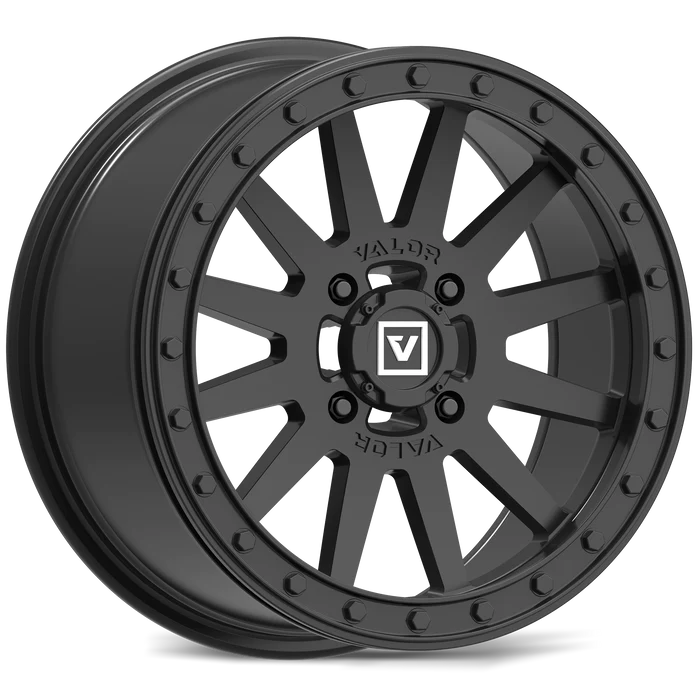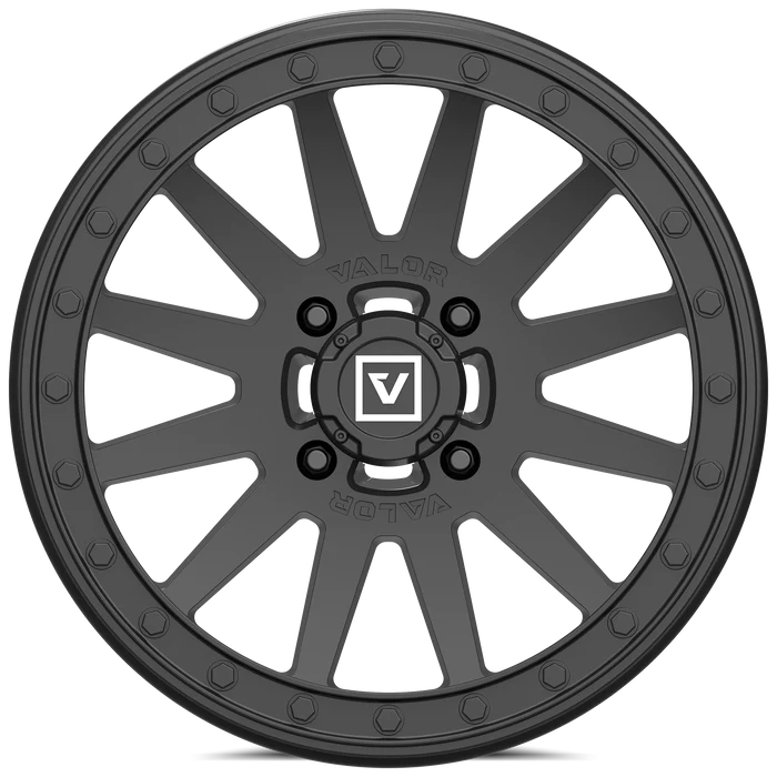 The V05 wheel is manufactured using only A356 aluminum with T6 heat treatment for one super strong wheel. Forged 6061 aluminum beadlock ring. Clean twelve spoke design with debossed VALOR logo. Offroad inspired and reinforced inner lip. Engineered to exceed SAE 2530 safety specifications. Bolt-on shorty center cap with embossed white logo.