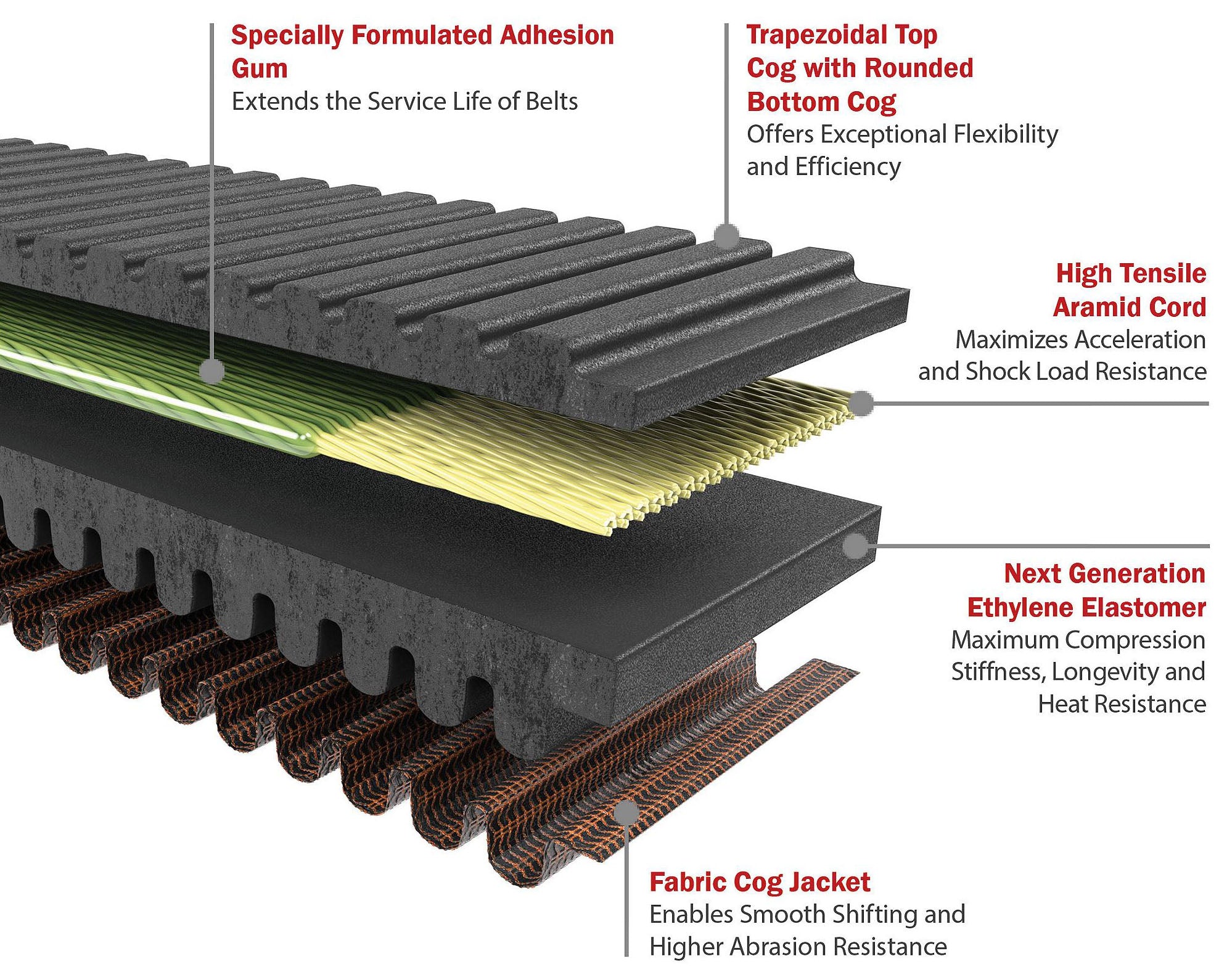 Gates G-Force™ RedLine™ CVT Belts are engineered from a patented, fiber-reinforced Ethylene Elastomer compound, providing maximum transverse stiffness and unmatched heat resistance which allows for increased durability, greater load-carrying capability and a higher effective operating temperature.
