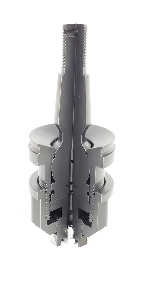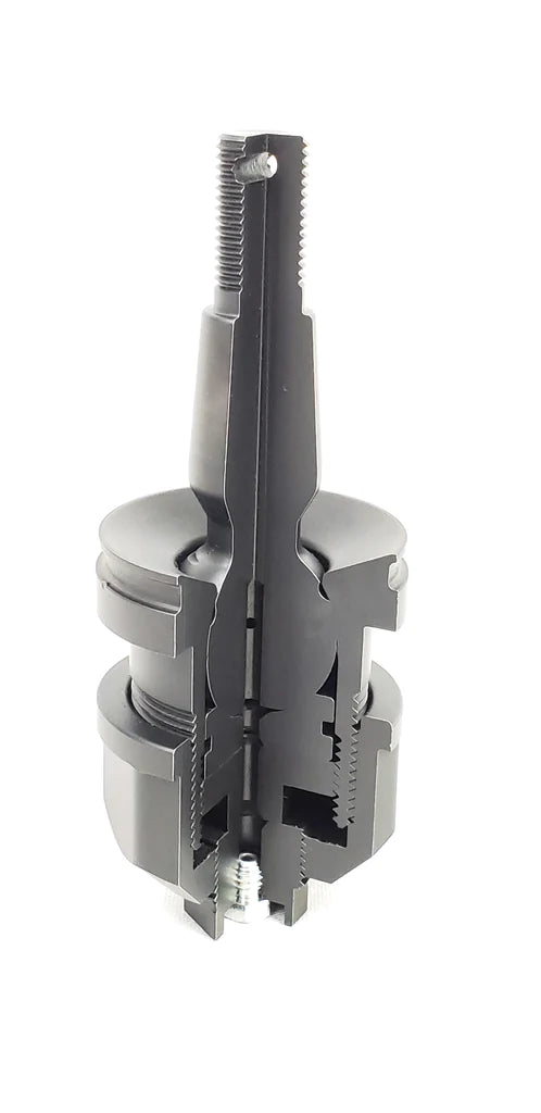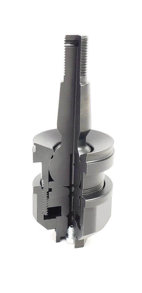 The most unique and proprietary part of our ball joints is the way in which we deliver grease to the stem itself. Through all 4 components which make up the inside of the ball joint there is a hole that is drilled allowing grease to be inserted into the flush mount grease fitting in the adjustment nut jamb bolt and pass all the way to the ball joint stem. In the stem, there is a cross drilled hole that allows grease to exit the side of the stem and grease the stem all the way around via a grease groove around the outside. Once grease is on the outside of the stem, we have a unique spiral groove that when the ball joint is pivoted it then carries the grease to the upper most portion of the ball joint. This ensures that the entire stem is greased to keep wear down and even more importantly keep water and other contaminants out.