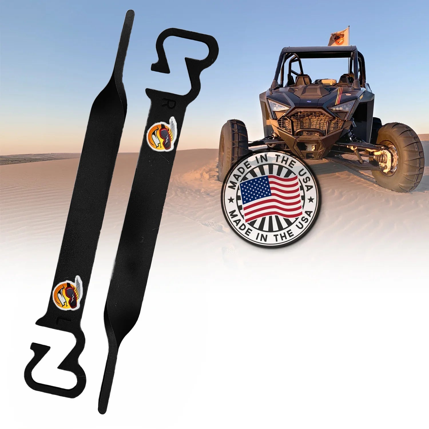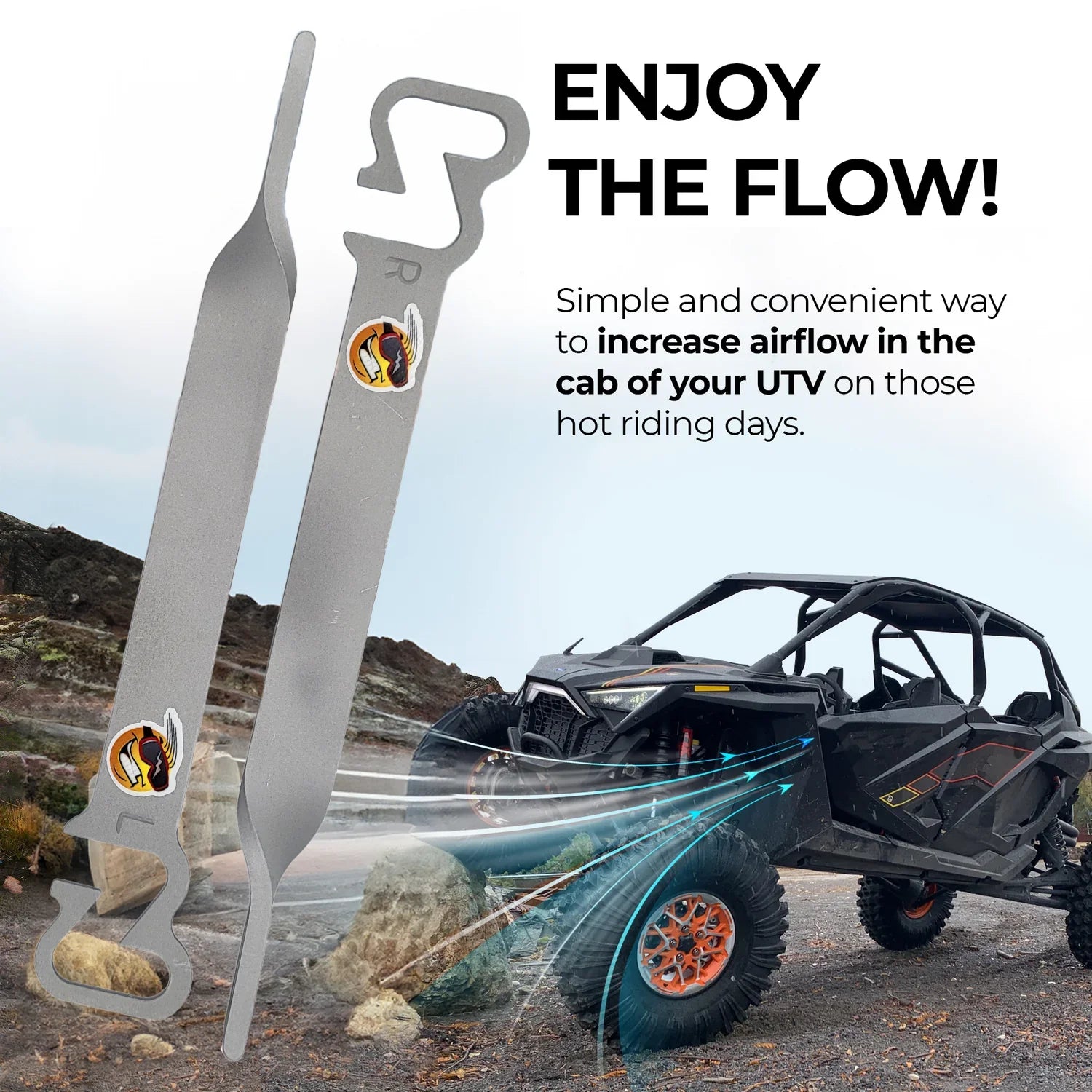Keep Smiling’s Easy-Cool XL UTV Door Latches are a cost-effective, simple and convenient way to increase airflow in the cab of your UTV on those hot riding days. The Easy-Cool Door Latches can be self-installed between the stock loop of the cab and the door latch. This product keeps your doors open approximately 5-10” while riding. The Easy-Cool XL Door Latch allows doors to remain solidly open during the ride experience. Just add between the stock door latch post and enjoy the flow!