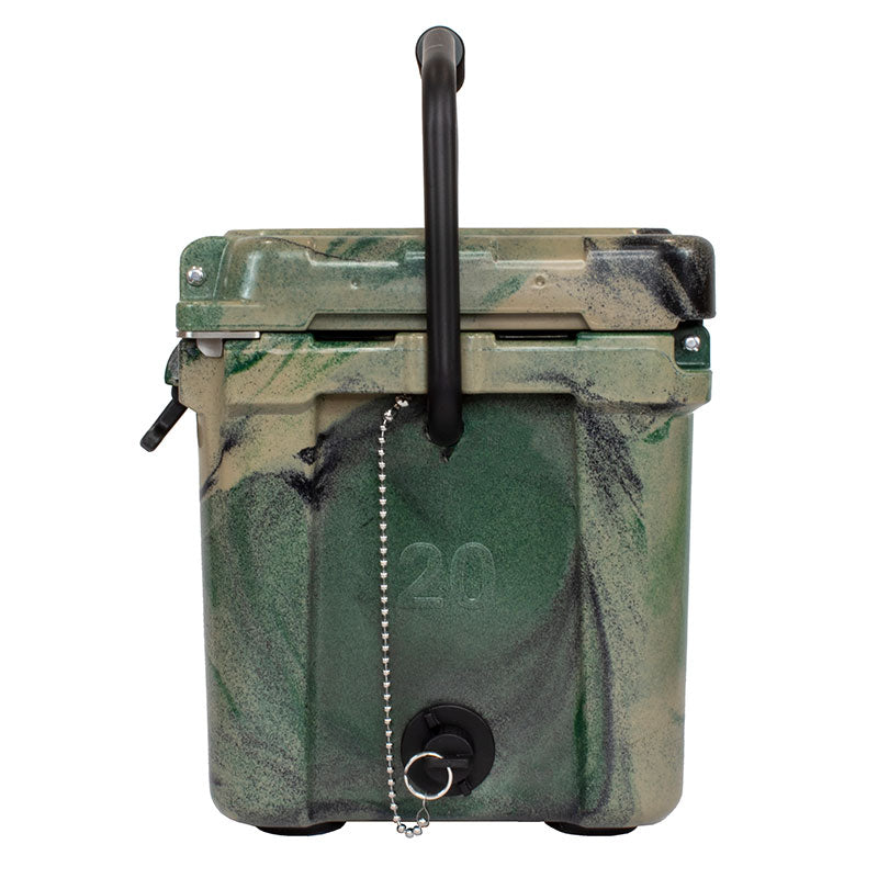 Frosted Frog 20qt camo cooler is high quality rotomolded with extra-thick walls for superior insulation. Manufactured with high density multi compound PU Foam walls and an environmentally friendly pressure-injected insulation system. Heavy duty rubber latches and non-slip, non-marking bottoms on all four corners. Commercial grade door lid seal gasket. All materials used are non-toxic and FDA approved.