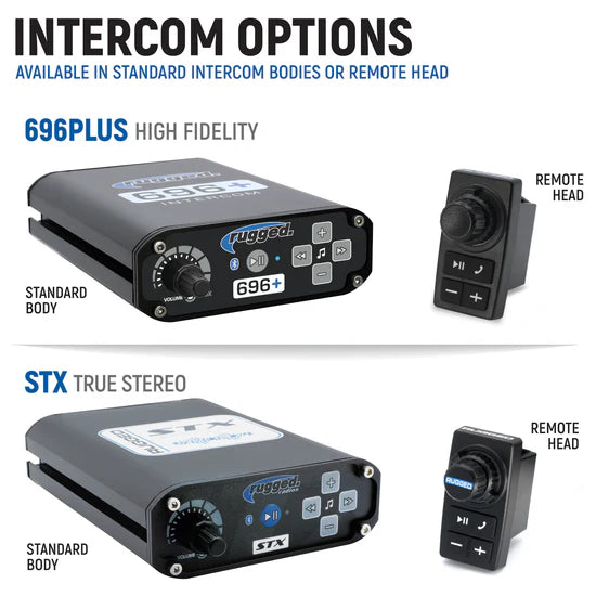 It all starts with the 696Plus or STX intercom. The intercom connects all of the passengers in the vehicle for seamless voice activation (VOX) conversation and incredible music listening. Simply adjust the VOX control and when you speak the music will dim to the background so all passengers can speak freely. Powered by Bluetooth, simply pair your phone and you’re ready to go.