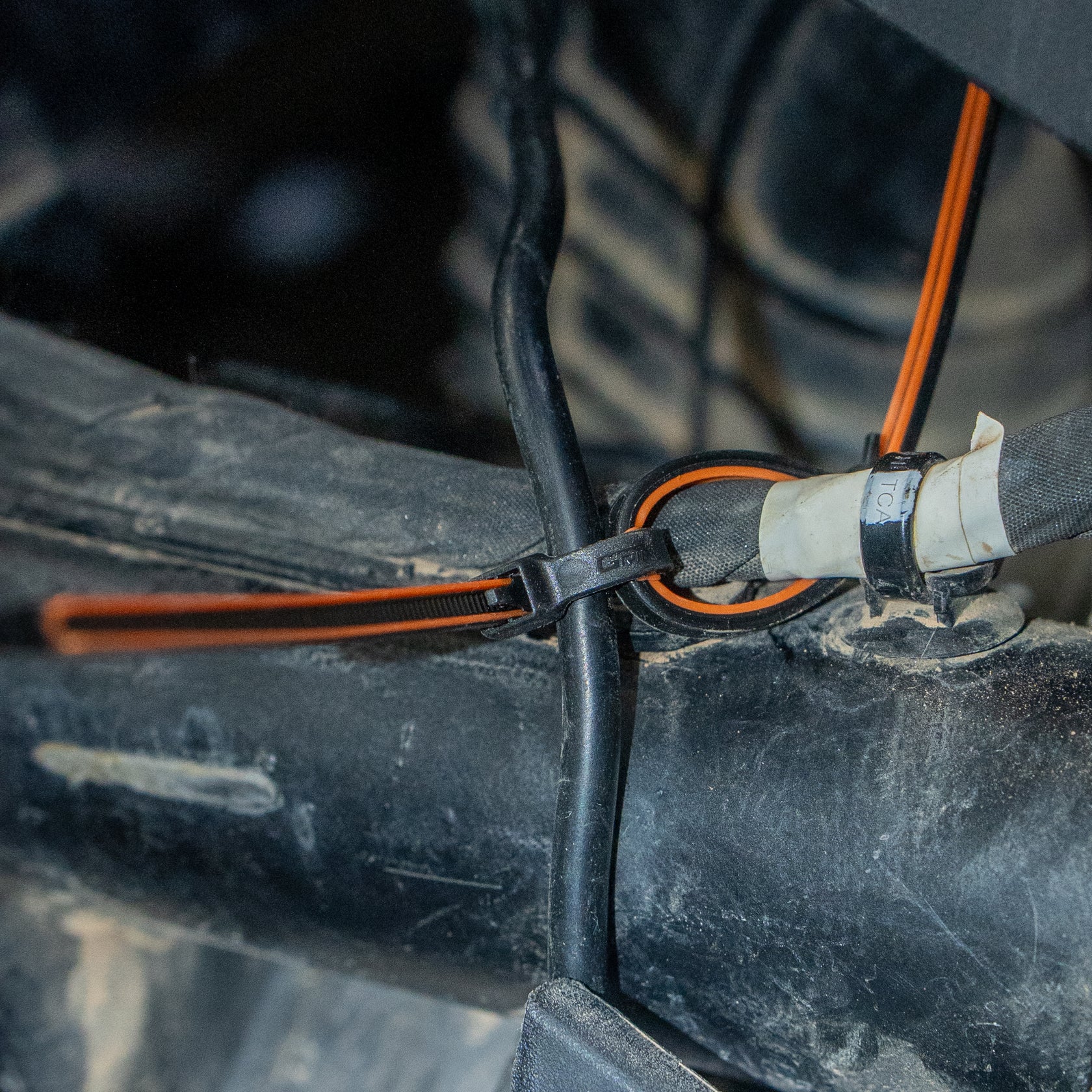 Rubber-Lined, Releasable GripLockTies™ were invented and patented initially for Air Racing and Automotive environments to solve the problems or ordinary zip ties that are either too tight and break or too loose and move around. GripLockTies™ Releasable, Rubber Lined Zip Ties solve the problems of damaged wires and cuts into structure and paint. Everyone in aviation knows (or should know) not to put ordinary zip ties on Engine Mounts. Old-style ties will loosen when the pressure deforms the wire and cut the wires or worse, cut through the paint and structure and cause damage. But with Rubber-Lined GripLockTies™ the rubber lining pads the wires and structure and holds it stable under vibration and eliminates the damage of old slip ties saving time, weight and money over Adel style or metal Clamps. GripLockTies were developed for aviation and racing with UV protection, higher heat rating and a super strong positive latch and can be repositioned during construction and then clipped flush. Available in standard UV Protected Black Dupont Nylon with Red or Blue or Orange Rubber-Lining.