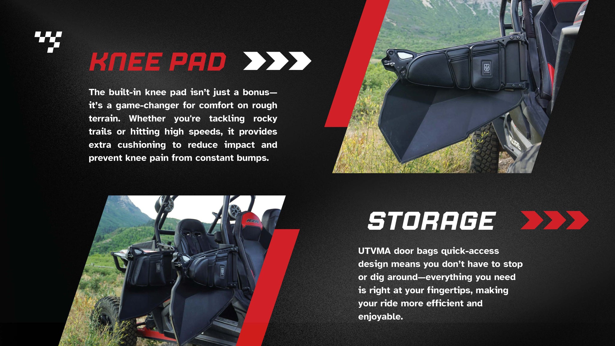 RZRFDBS2Set of front door bags for your RZR. You're not only adding storage-- you're adding a knee pad that you'll never ride without again.