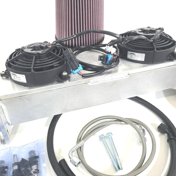 5. Large Aluminum Intercooler: With a sizeable 2.5"x6"x20" intercooler boasting CNC Billet aluminum end tanks, our kit ensures that your engine breathes cool air, resulting in maximum performance. We've also added a billet CNC'd intercooler fan mount, equipped to handle two 6" SPAL fans for enhanced cooling.