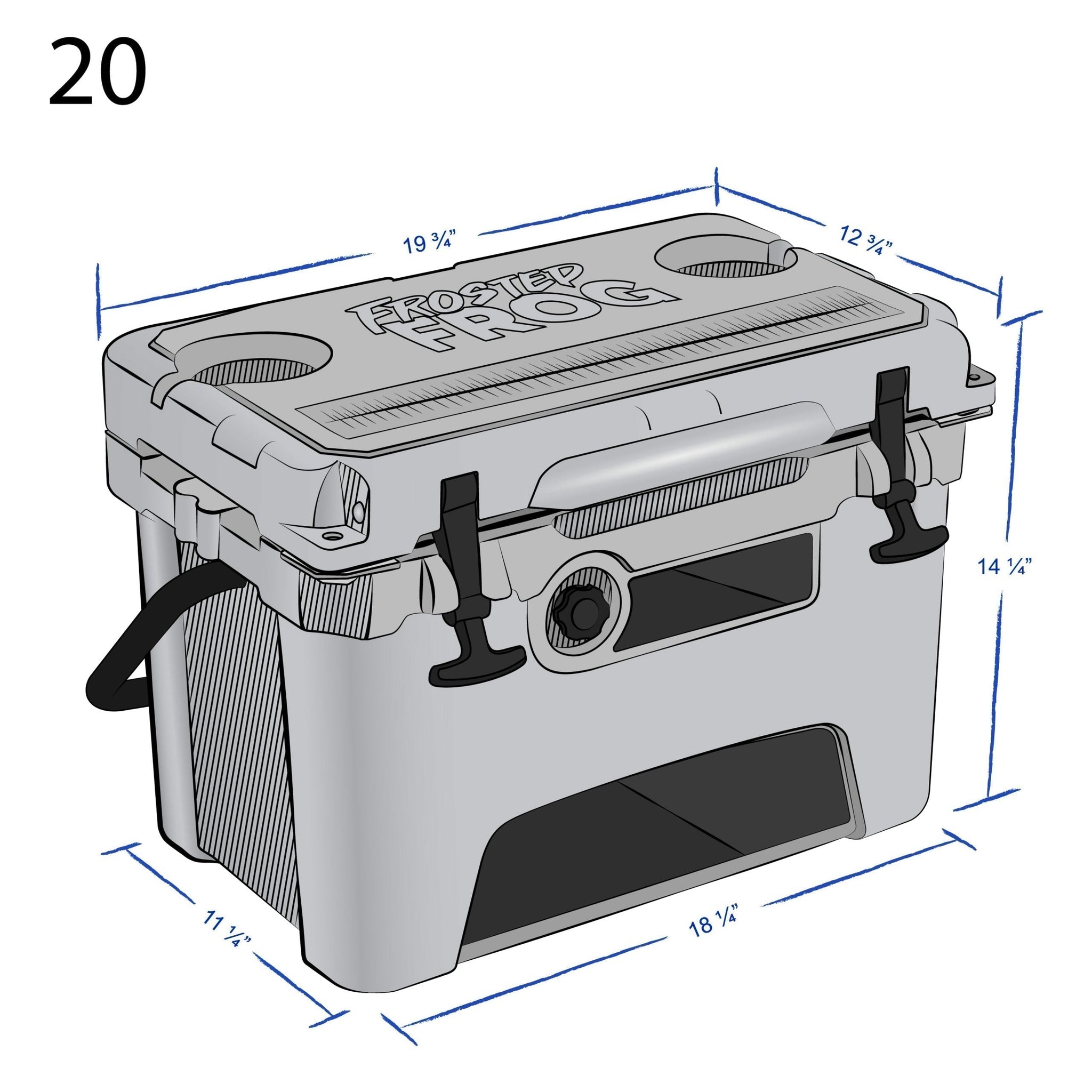 Frosted Frog 20qt cooler is high quality rotomolded with extra-thick walls for superior insulation. Manufactured with high density multi compound PU Foam walls and an environmentally friendly pressure-injected insulation system. Heavy duty rubber latches and non-slip, non-marking bottoms on all four corners. Commercial grade door lid seal gasket. All materials used are non-toxic and FDA approved.