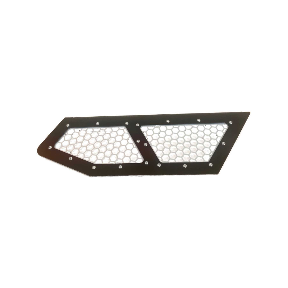 Our Honda Talon Lower Doors are built to bolt directly onto your OEM doors with no cutting required. Installation is simple—just drill a few small holes in the bottom of your stock doors and use the supplied hardware to mount the new panels. Each lower door frame is CNC laser-cut from .125-inch aluminum and finished with a durable black powder coat. The hexagon mesh is also CNC laser-cut from .0625-inch aluminum and powder-coated to match Honda Talon color options.