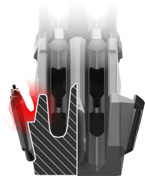 ERGONOMICALLY DESIGNED POCKETS ALLOW EASY ACCESS REGARDLESS OF WHICH HOLSTER OR WHICH HAND IS USED.