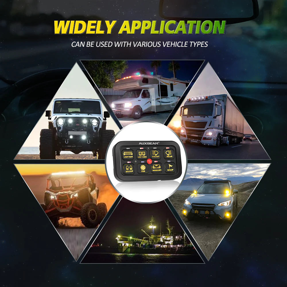 - 8-Gang one-sided outlet switch panel. It allows you to control up to 8 different LED lights or devices. Command all your vehicle accessories by the tap of your finger.