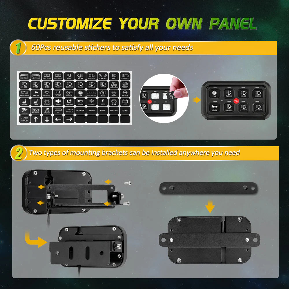 - With 2 types of mounting brackets, you can mount the panel in the best location for your vehicle, such as the dash panel, center console, overhead sunglasses holder, etc.