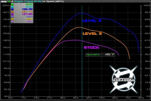 - Our level 3 tune puts the hammer down on 91-93 octane. Like our level 2, this tune simply rips on pump gas but requires a full exhaust like our 3" system to run 91 octane as well as a high flow intake. If you run 93 octane (or boost your 91 to 93) you can run this tune on the factory exhaust(however you'll leave some power on the table). It will peak around 18-19psi and sustain around 17-17.5psi.... half a pound of boost higher than level 2. This is a big 23-25hp gain over factory. This tune requires a high flow intake kit like ours. Clutching is recommended. We recommend shortening your waste gate rode by 1 turn with this tune. 2017 models with 18 fuel pumps should adjust 2-3 turns.