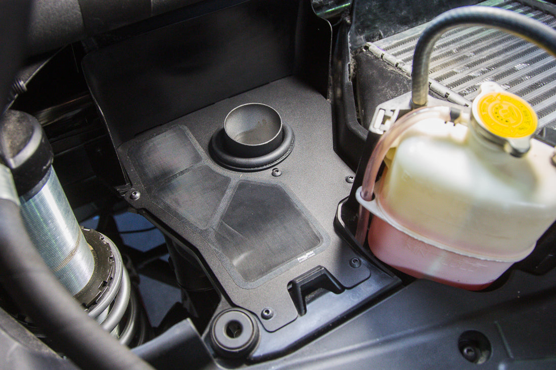 Below the filter is a precision laser cut aluminum plate that bolts to the factory lower air box. This features custom Frogzskin material that is implemented into the aluminum frame. Unlike other companies hand trim foam that may let particulates through into your engine and clutch housing, the Frogzskin material is a proper engineered solution. There is no flow restrictions to keep your clutch and intake running cool! The Frogzskin mesh repels water, dirt, dust, etc. while still allowing air to flow freely. The Frogzskin Mesh is a woven polyester material and is HYDROPHOBIC, meaning it will repel water and splashes of water, but it is NOT waterproof. Eliminating the heavy and bulky Donaldson filter, the Agency Power intake then features an aluminum tube with fittings that attaches directly to your turbochargers compressor side with provided AP silicone coupler. Each aluminum part is powder coated in a matte black for a clean and stylish finish. Clamps are included to make the kit an easy bolt-on.