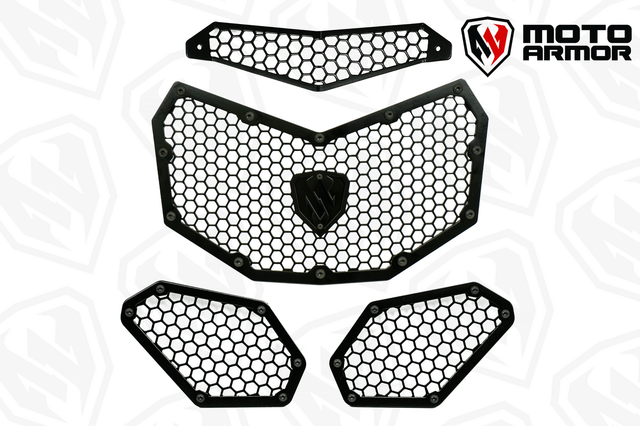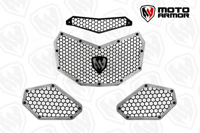 Add style and protection without sacrificing air flow with a Moto Armor Premium Radiator Grill set. Too many aftermarket grills have large openings that compromise protection, or they block too much airflow that compromises cooling. Moto Armor's honeycomb design offers the best combination of protection without affecting flow. Made out of 1/8" thick aluminum which is twice as thick as most metal grills. Full aluminum construction means no rusting in the event of a chip. Stainless steel bolts attach the grills without the worry of corrosion.