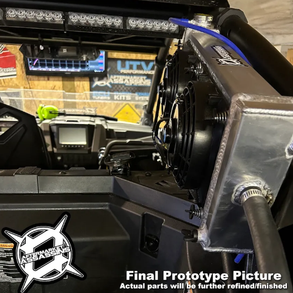 - Keep in mind of our heat exchanger location as it may interfere with accessories or aftermarket roll cages. The heat exchanger is 20 x 8 x 2.5" but is 24" overall with the coolant ports coming out each end. This is designed to be mounted nicely on the passenger side of the cage. Since it's bare aluminum, most local fab shops can handle such a job easily if needing to modify.
