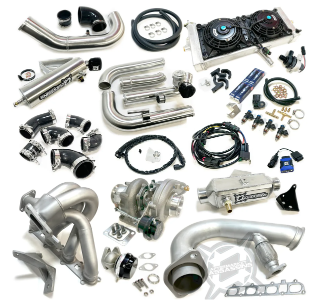- Kit Includes: Turbocharger (assembled with oil fittings, and billet internal wastegate), custom stainless turbo header, billet external wastegate (yep, kit uses 2 wastegates), exhaust gaskets, oil adapters, drain line, feed line, oil drain plate, v-band exhaust clamps, exhaust downpipe, slip-on exhaust(center exit with 3" cutout), water to air intercooler, water pump with mount, heat exchanger with fans/wiring, intake tube kit, charge air tube kit with blow off valve, boost control T, boost line and adapters, 3 bar map sensor, big injectors, lower heat iridium spark plugs, catch can (specific just for this kit), S3 turbo clutch kit, ECU unlock , 4 credits, AA turbo tune(s) for AA/HP Tuners RTD device (Start in any gear with brake now available).