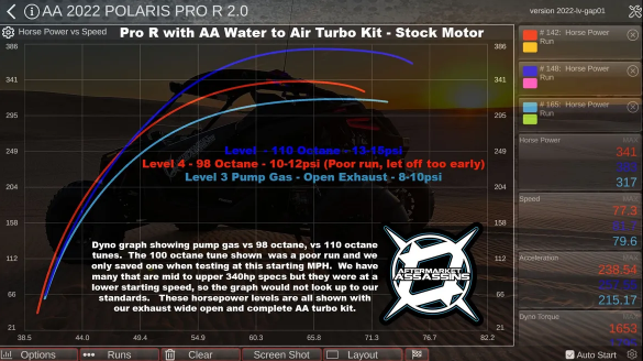 - Level 3 (91-93 Octane - 8-10 PSI - 317 RWHP, 380-390 crank HP): Take level 2 but add a few lbs of boost. This uses our largest hole jet regulator to add 1-2 PSI over level 2. To achieve this on pump gas we have a richer fuel curve to stay away from engine knock protection. This is pushing the limits of pump gas, so while it runs very well on 91-93 and you'd have no issues anywhere, a splash of octane boost when running hard (like in the dunes) helps keep you away from knock protection (ECU pulling timing/power) from inadequate fuels.