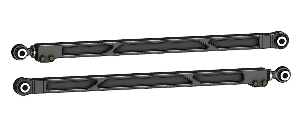 The lower rods pick up 1" of ground clearance in the peak of the radius rods and over 2" in some areas. The front of the rod has a massive 3/4" tall 45 degree ramped to help get you up and over the obstacle instead of getting hung up. Integrated gussets strengthen the rod and keep them from deflecting in extreme bottom outs and odd hits. We're using the wide series of FK uniballs which is the WSSX12T.