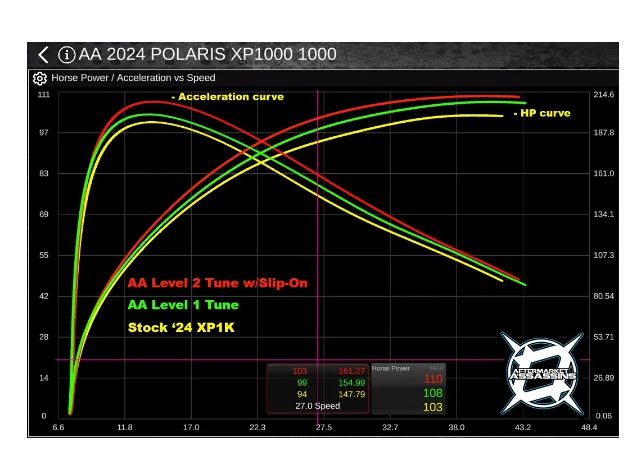 • Why AA tunes over others?  We have been tuning UTV's with CVT clutches for a long time, longer than almost anyone in our field going back to the 800 RZR.  Tuning a CVT vehicle properly is not an easy task as you have so many variables at one time.  We spend the time to wheel dyno(with actual UTV tires) correctly per modification, and have advanced ECU calibration and clutching knowledge to do so. Every change in horsepower can result in us changing clutching several times. We also develop most of our supporting mods so we know everything works correctly, and build parts to fit the vehicles needs.  Lastly and honestly the most important; we then back up our results with real world data logging on local trails and our facility on 110 acres.  It's this combination that truly makes the difference and why AA normally has a faster vehicle with the same or less rated tune horsepower.   We left nothing on the table on the XP1K bolt-on parts, if others claim more power/gains for the same mods use caution in believing it!