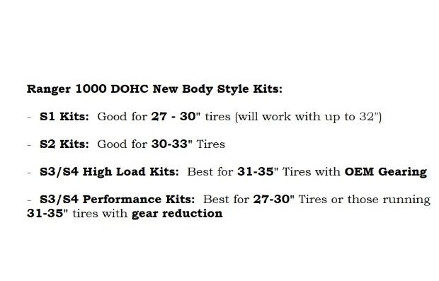 - Performance Helix 107-1065: Aggressive helix with acceleration/higher horsepower/aggressive fast pace drivers in mind. Works best on Rangers with 27-30" tires and OEM gearing or those running 31-35" tires with gear reduction.