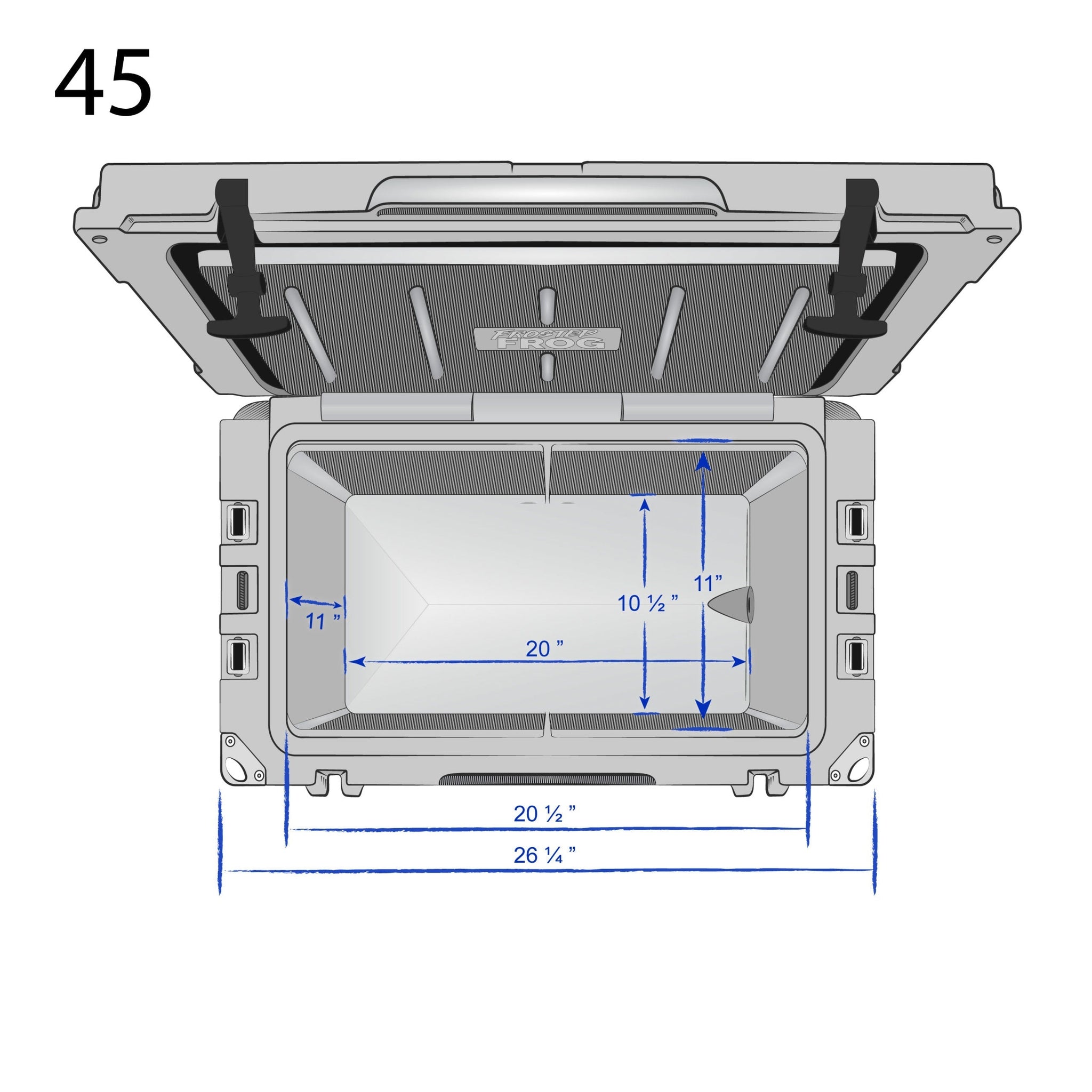 Frosted Frog 45qt camo cooler is high quality rotomolded with extra-thick walls for superior insulation. Manufactured with high density multi compound PU Foam walls and an environmentally friendly pressure-injected insulation system. Heavy duty rubber latches and non-slip, non-marking bottoms on all four corners. Commercial grade door lid seal gasket. All materials used are non-toxic and FDA approved.