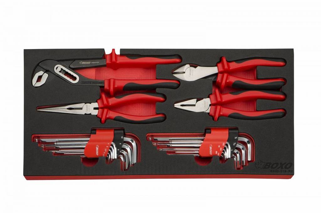 Each tool is set in an EVA foam tool storage solution tray making tools fit securely in drawers to keep organized and no shifting during motion. The tool box is curated with heavy-duty 20-gauge steel, ball-bearing drawer slides that allow for great service life, three generous drawers and a deep top storage compartment for organization and flexibility. Comfortable side or center handles make for ease of transportation. The powder coated paint finish offers durable long lasting protection.