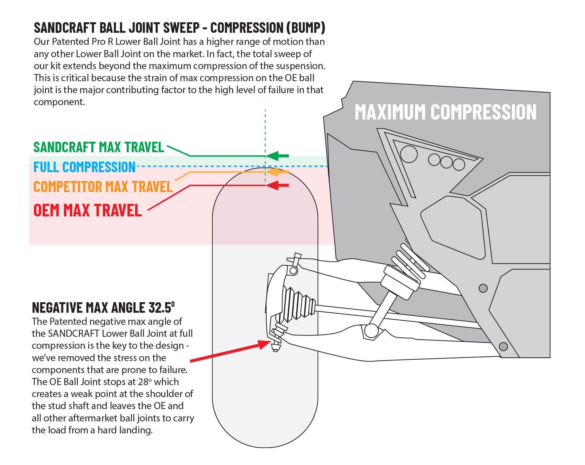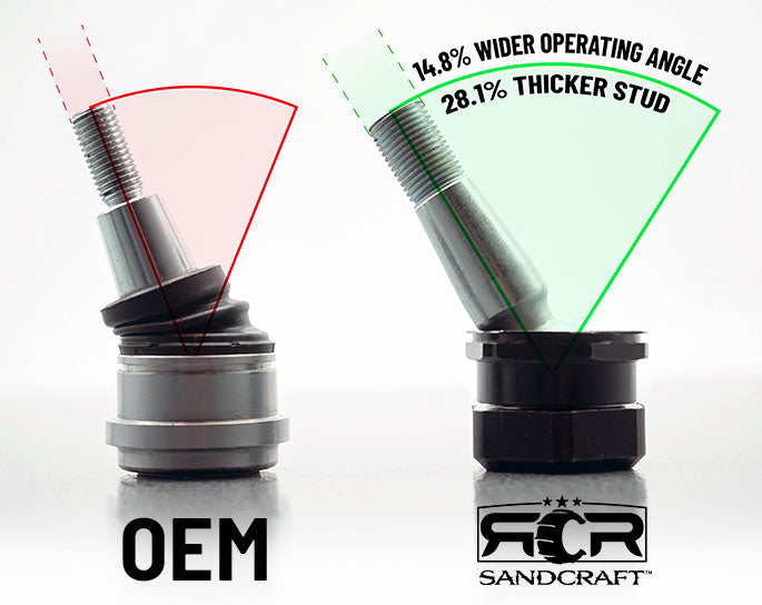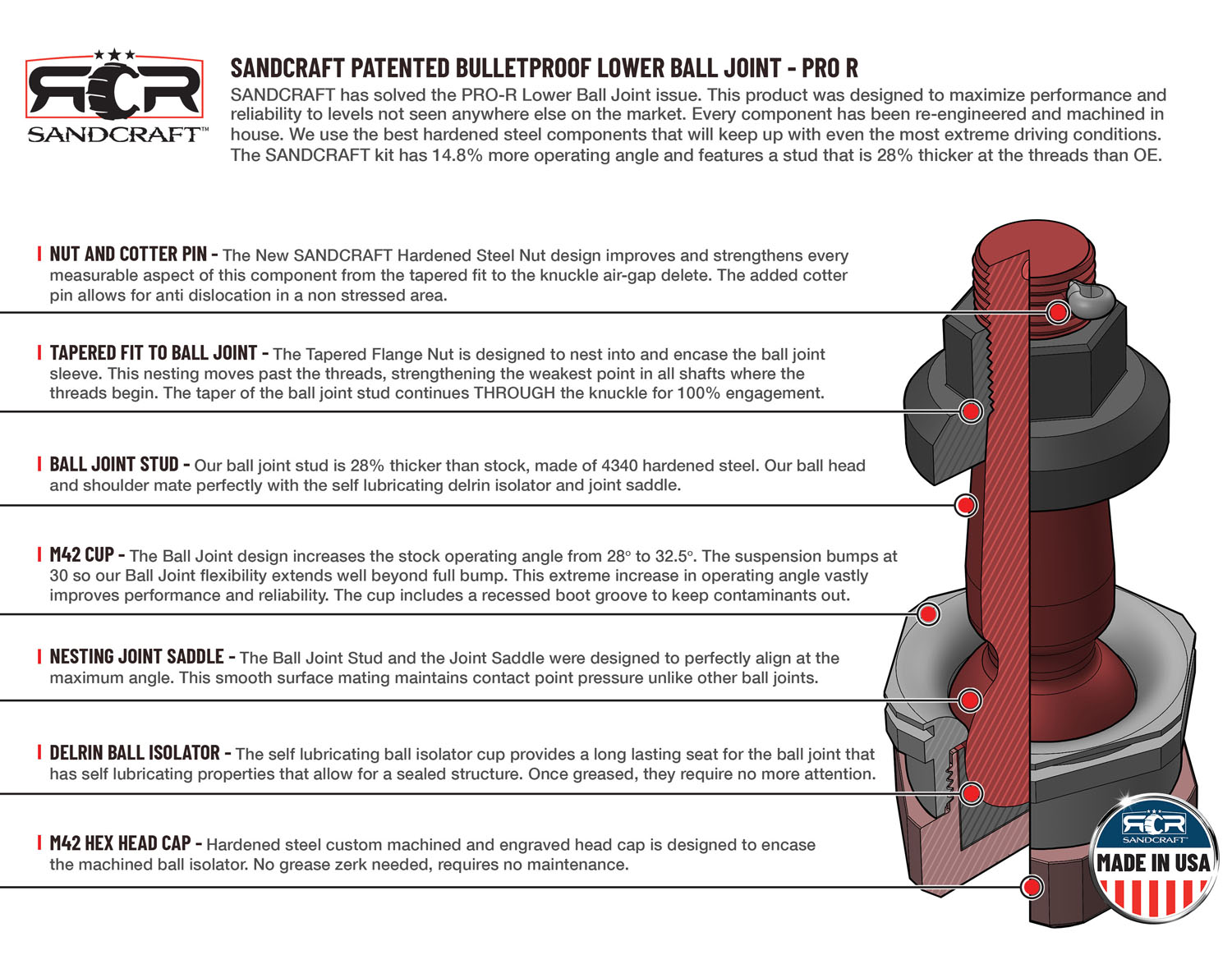 SANDCRAFT has solved the PRO-R/TURBO-R Lower Ball Joint issue. This product was designed to maximize performance and reliability to levels not seen anywhere else on the market. Every component has been re-engineered and machined in house. We use the best hardened steel components that will keep up with even the most extreme driving conditions. The SANDCRAFT kit has 14.8% more operating angle and features a stud that is 28% thicker at the threads than OE.
