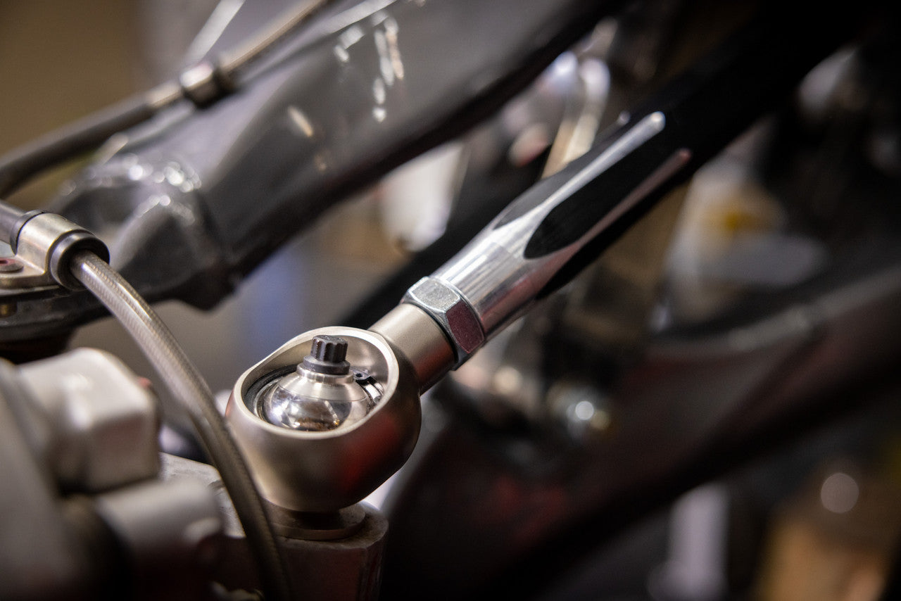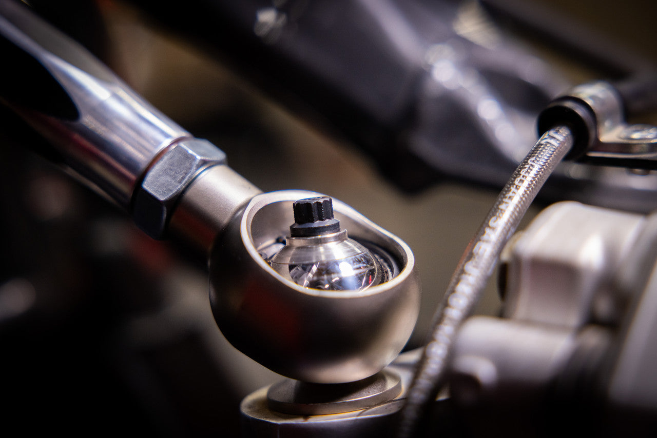 Factory tie rods also utilize a ball joint with a tapered pin at the spindle. This factory tapered pin design means that the installed height of the ball joint can vary from car to car causing different amounts of bump steer and steering wheel feedback. The outer joint in our kit has a custom made rod end with a huge 3/4” uniball (pictured with BSD pin below) for massive strength and longevity. Also included in our kit is our patented BSD pin kit that is height-adjustable (using the included BSD spacers), made from heat treated high carbon steel. The design improvements in our pin kit give you 4X the strength of a factory tapered pin and maximize height adjustability so you can eliminate bump steer. Our tie rod and pin kit is the only one on the market that makes zero bump steer and minimal steering feedback possible!