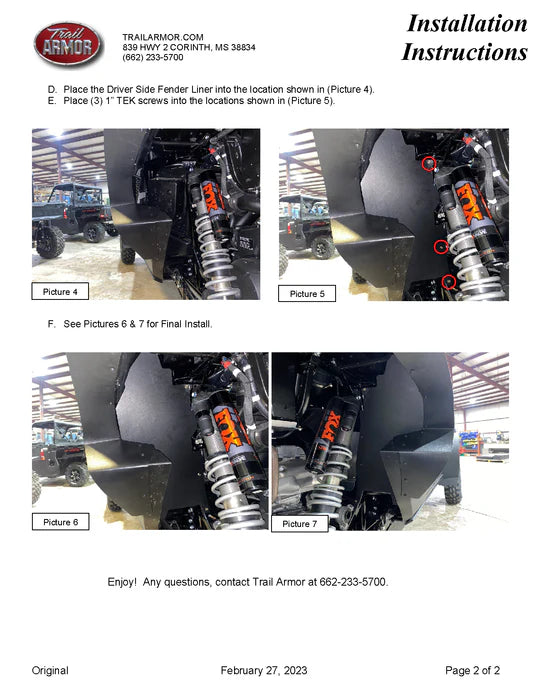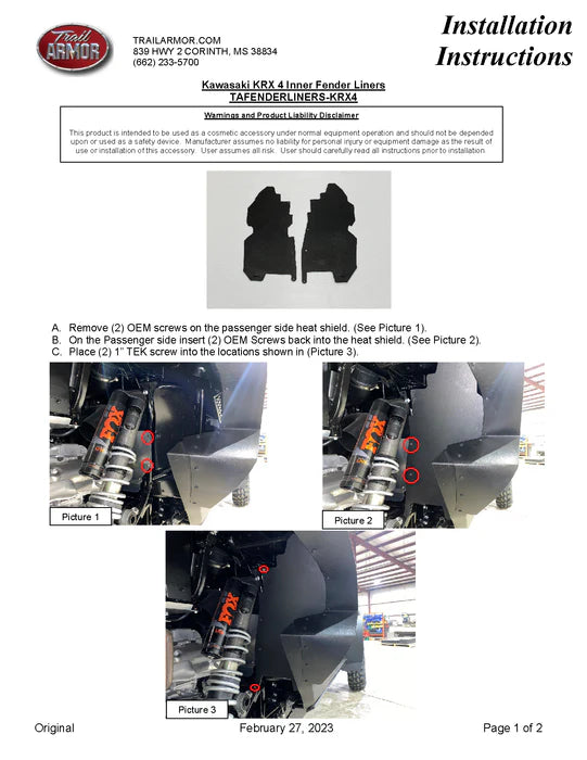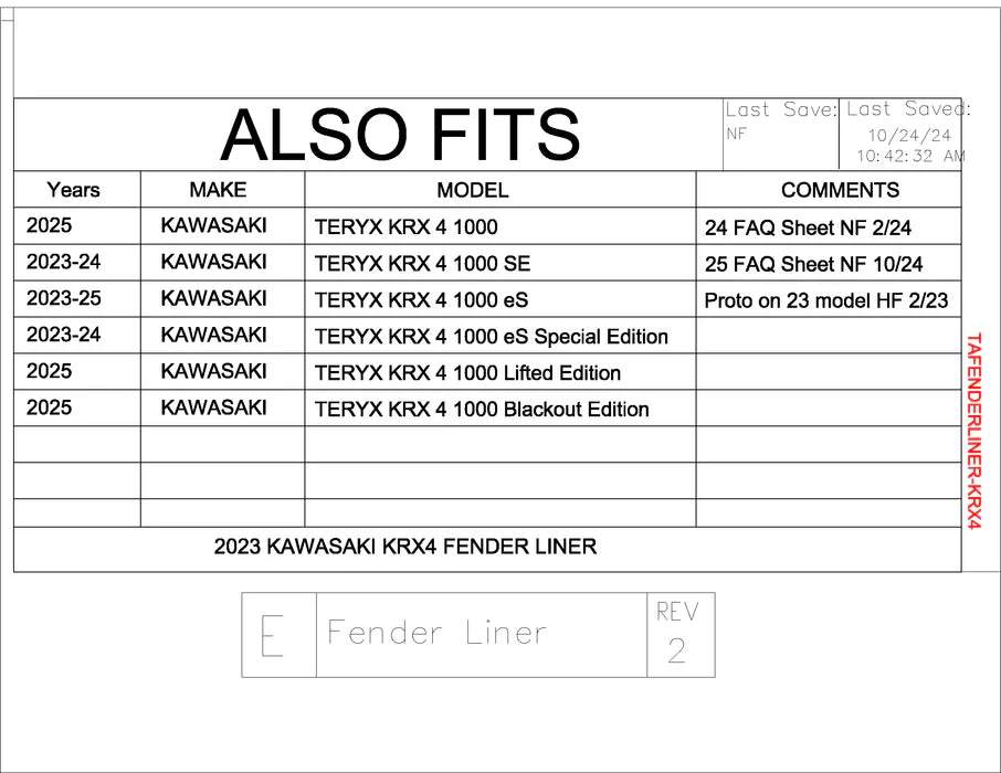 - Trail Armor's Inner Fender Liner for the 2023 - 2025 Kawasaki KRX 4 1000 closes off the gaps in the driver and passenger rear wheel wells to keep the mud, water and debris out of your cab.