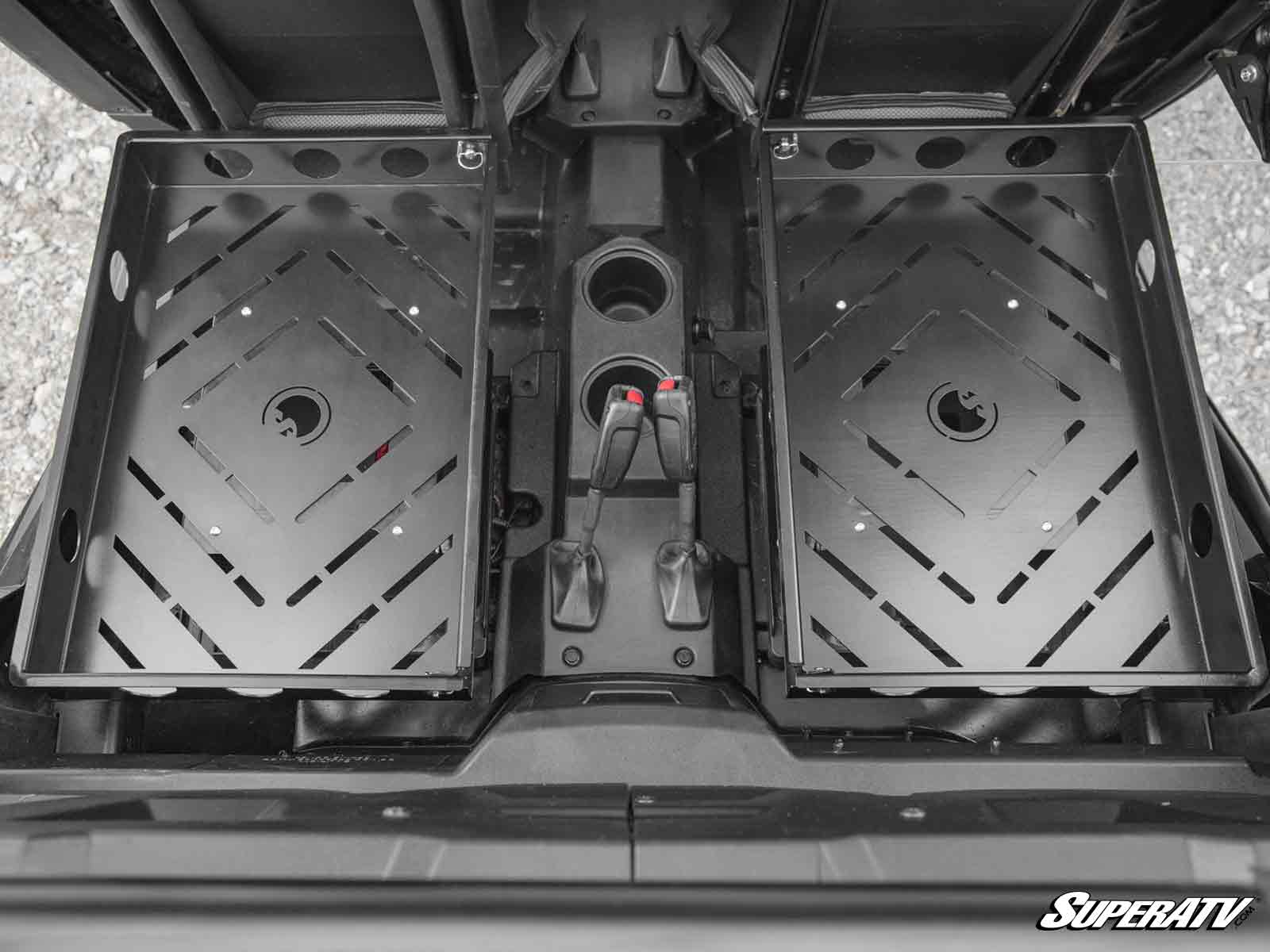This is a RZR rear seat delete kit that can adapt to whatever the day calls for. You can remove your entire back row and this cargo rack will reach from door to door, covering up your center console in the process. Or you can remove a single seat and convert it to a smaller rack. You can also keep your center console uncovered and convert each seat to it’s own separate rack. Whatever you do, it bolts directly to your seat and gives you tons of tie down points to secure all your cargo.