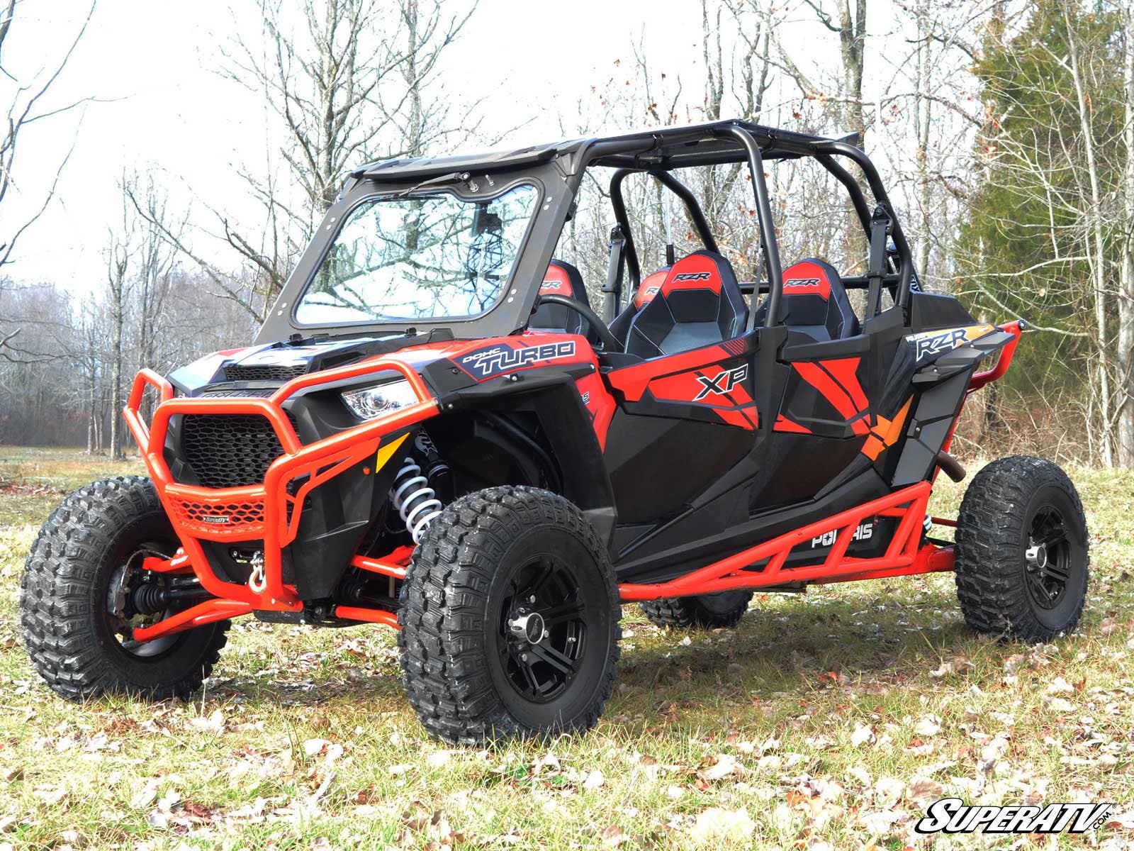 SuperATV’s nerf bars are built to last with 1.75” diameter heavy-duty steel tubing—tough enough to handle the weight your RZR Turbo can throw around. To top it off, we covered these tree kickers in a durable, UV resistant powder coating to keep them looking good for years. We didn’t skimp out on any details and designed this kit to fit your 4 seater securely and easily so you can slap it on your machine and go with as little down time as possible.