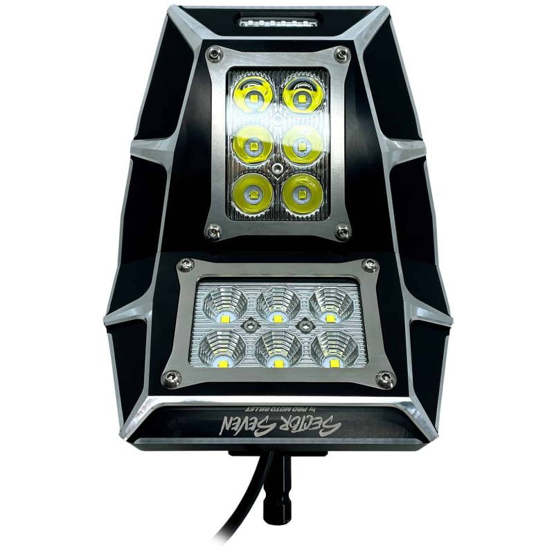 Sector Seven SAWTOOTH LED light mirrors will revolutionize the way you see the world, day and night! The ultimate upgrade to help you light up a 210-degree field of vision in front and convex mirrors for maximum rear view. Amber LED Side Marker Lights integrated into the CNC machined 6061 billet aluminum provide superior strength and toughness, with removable bezel that can be color coated. Adjustable break away action lets you determine arm strength, while the ball joint adjustable mirror enables adjustment without chance of vibration. With 180-degree rotation to assist in rear illumination, SAWTOOTHS are a versatile, superior light mirror combination. Navigating tight terrain has never been so easy!