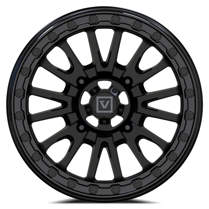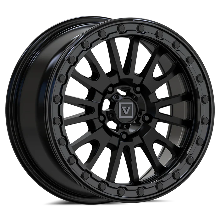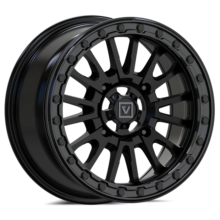 The V16 beadlock UTV wheel by Valor Offroad is available in both Satin Gunmetal and Satin Black. Each wheel is meticulously hand-painted by skilled technicians, ensuring long-lasting protection against the world's harshest trails. The Satin Gunmetal V16 has a matching bolt-on satin gunmetal center cap with a satin black V-Logo and a satin black billet beadlock ring.