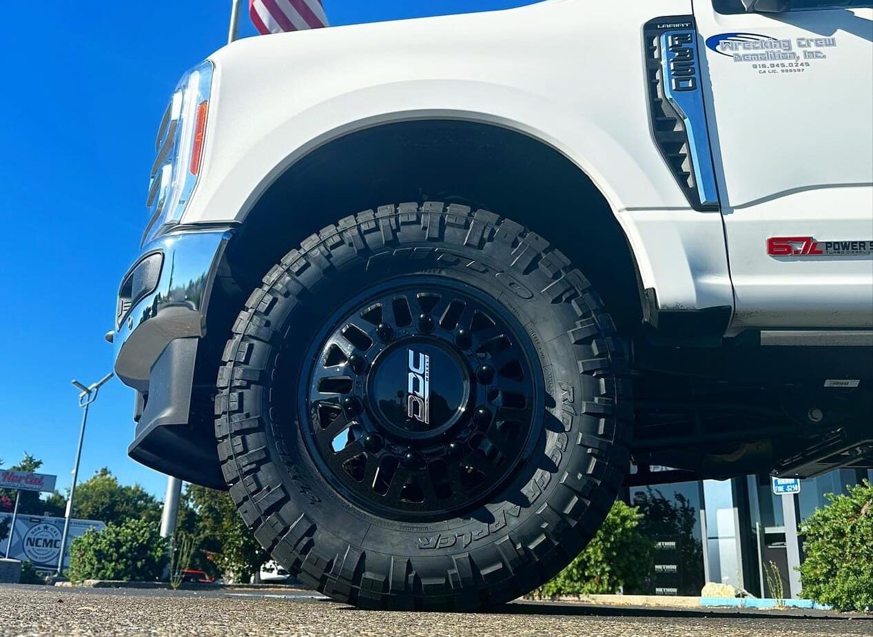 - No Rear Dual Spacers: ALL 22” DDC Wheel packages fit up to 12.50” wide tires & 20” Aftermath, The Ten, The Mesh, The Spoke, The Shield DDC Wheel packages fit up to a 295/65R20 (35.12×11.77) or 37×11.50 wide tires. NOTE: 20” The Shield flush fit a max 11.50” width tire