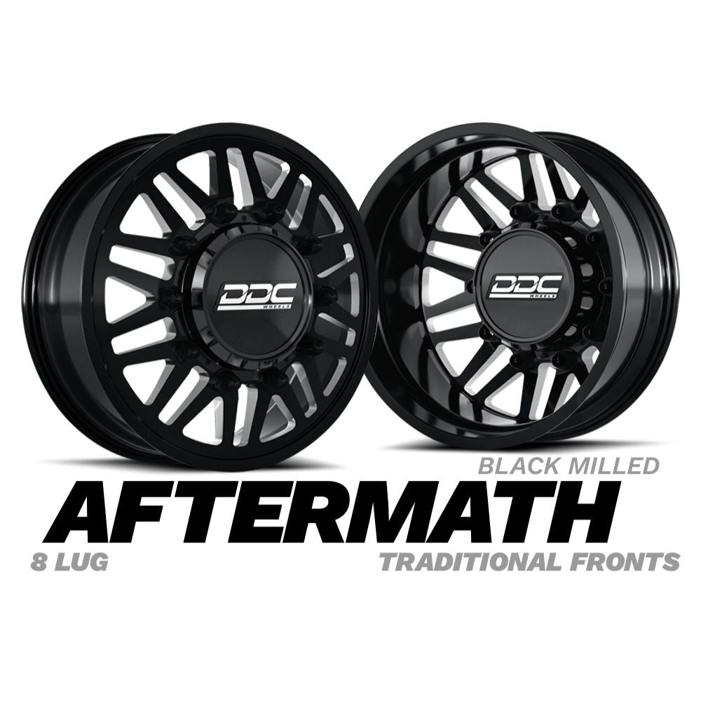 DDC Wheels are designed to bring superior form, fit and function to your dually pickup. Our cast 8 lug dually wheels incorporate an attractive 10 lug design that comes standard with our bullet style lug covers, or these can be upgraded to our billet spike lug covers. (Aftermath 10×225 wheels do not have a lug cover option.)