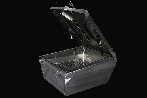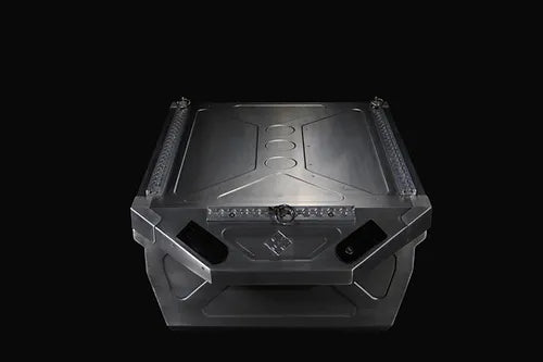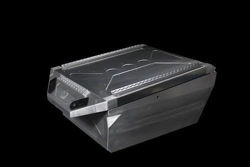 Sealed locking aluminum storage box and spare tire carrier built around the Polaris RZR platform. Gas struts weighted to 65lbs for the spare tire allow easy access into the weather proof storage area which is designed to prevent entry of any water or dust you may kick up on the trail. Dividers are included for organization of the interior separating spare parts from daily essentials.