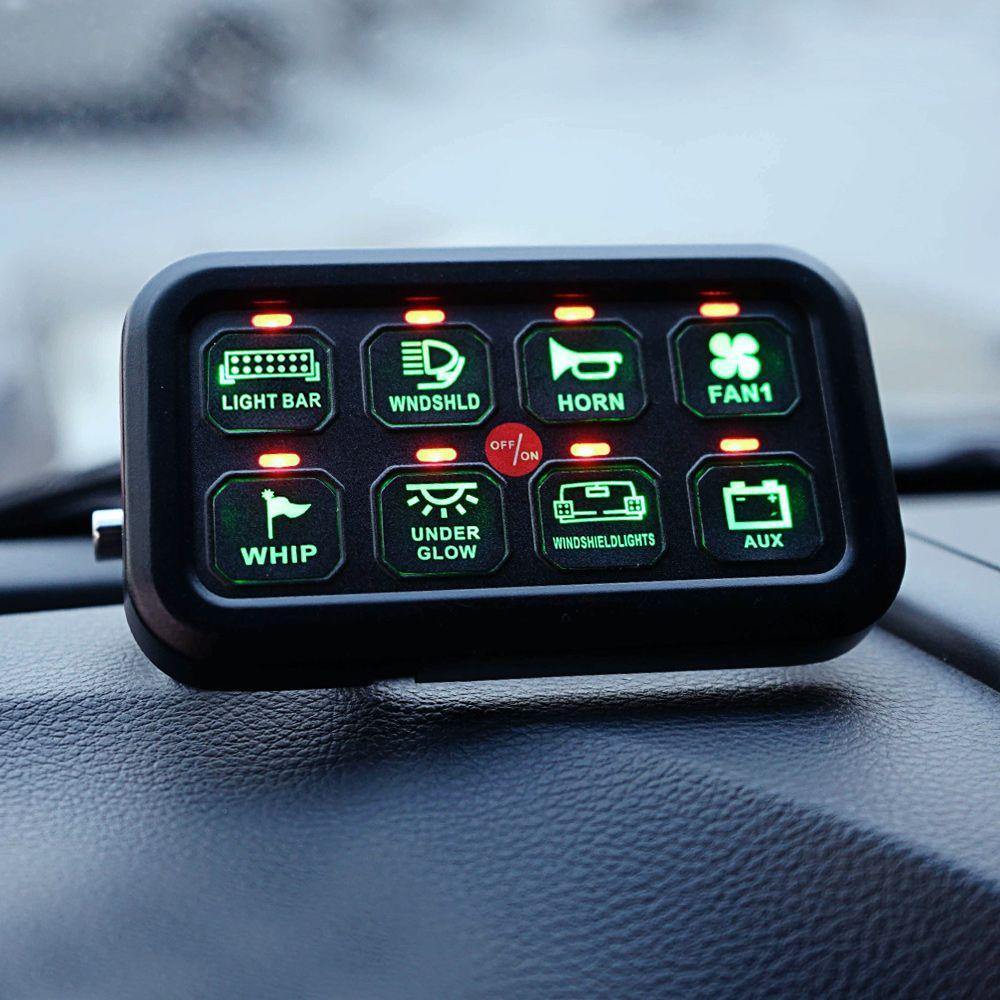 • 8 Gang on-off control switch panel. It allows you to control up to 8 different LED lights or devices. Command all your vehicle accessories by the tap of your finger.