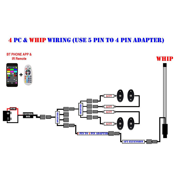 Our all new RGB+W flex wrapped whips are fully plug and play with our RGB+W rock light kits. Makes installation a breeze and allows you to plug these directly into your current rock light system or add on a dedicated controller and control separately or together. Our all new RGB+W Bluetooth & RF Controller allows dual control from a bluetooth app or a back up handheld remote. Controller also includes brake override option which will turn the kit on and to red if it is wired to your positive brake wire as well as a white override function that can be used to turn the kit white with a dome switch or courtesy light.