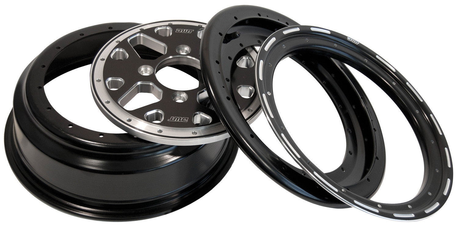 Introducing the unique new SECTOR 3 piece wheel from DWT. Made in the USA, this awesome new TRUE 3 piece wheel is fully serviceable and constructed of super strong lightweight heat treated 6061 .190 aluminum. All of our heat treatment is done in our factory, assuring a true and proper procedure. The Sector consists of two lightweight aluminum wheel halves which bolt to a stylish billet center. An air tight seal is formed by a strong rubber ring seated in a precision machined groove between each wheel half and the wheel center. Available in 12” and 14” sizes in many offsets.