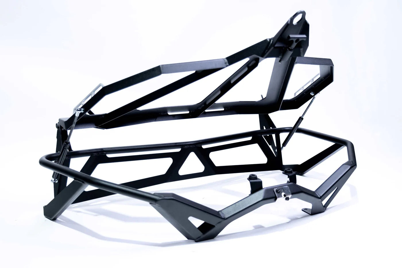Our Baja Style Spare Tire Rack for the 2017+ Can Am X3 Maverick is crafted from aluminum rails and finished in a hammer black powder coat. It includes hold down mounts and Y straps to securely mount your spare. Dual gas struts provide assistance for opening the tire rack to access a storage area for tools or gear. The Baja Rack features a direct fit bolt-on installation.