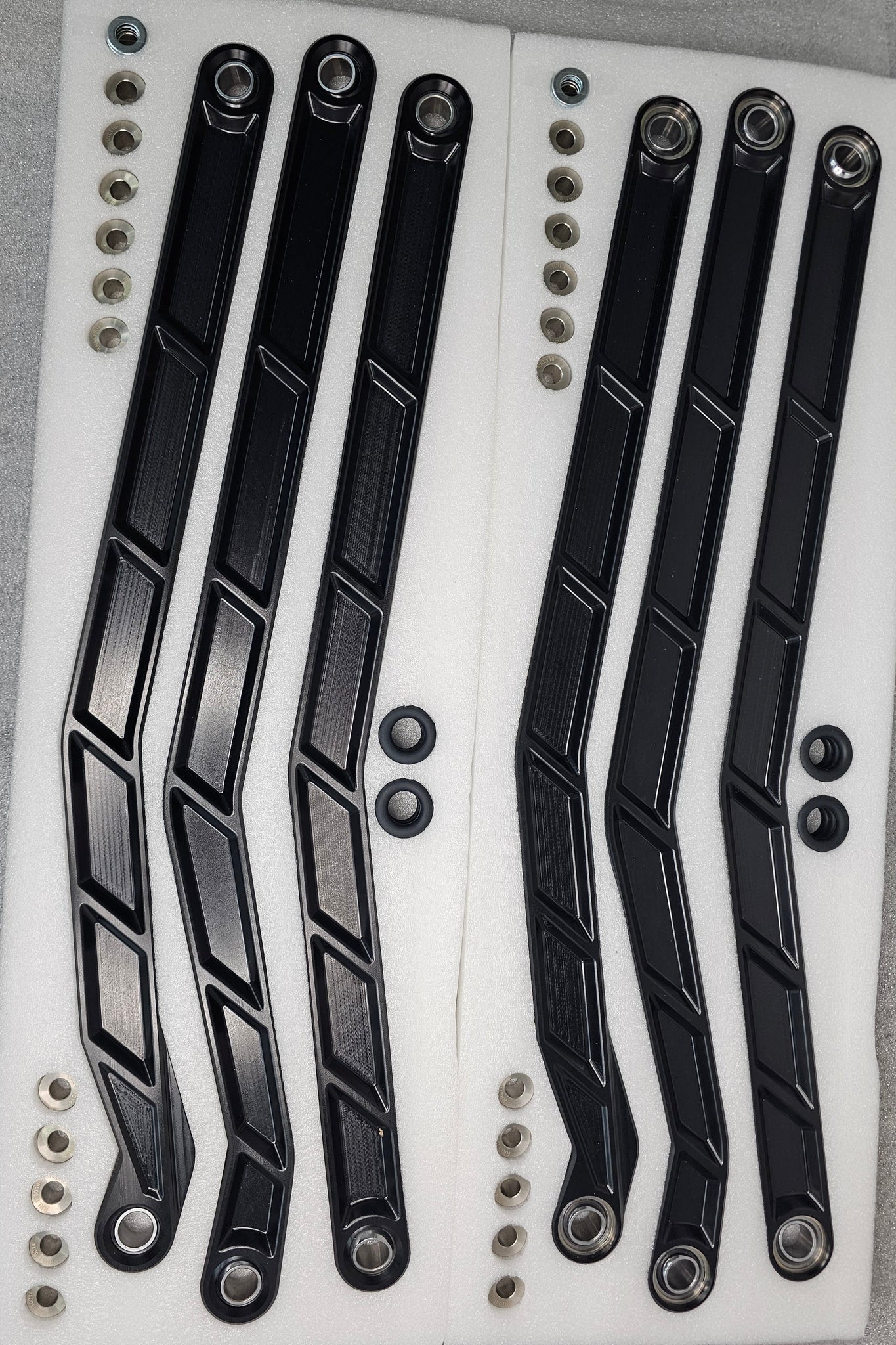 Our X3 Radius Rods were designed to improve your suspension performance while bringing a unique style to your ride. CNC machined from 6061 billet aluminum, the rods are hard anodized black for longer lasting color. Performance improvements include teflon coated high strength uni-balls that include misalignment spacers. Rubber dust rings help keep small pebbles and dust out of the joints.  Installation is quick and easy as the rod arms bolt into the factory position. Install diagram click here.