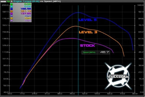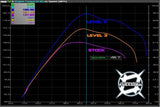 - Our level 3 tune puts the hammer down on 91-93 octane. Like our level 2, this tune simply rips on pump gas but requires a full exhaust like our 3" system to run 91 octane as well as a high flow intake. If you run 93 octane (or boost your 91 to 93) you can run this tune on the factory exhaust(however you'll leave some power on the table). It will peak around 18-19psi and sustain around 17-17.5psi.... half a pound of boost higher than level 2. This is a big 23-25hp gain over factory. This tune requires a high flow intake kit like ours. Clutching is recommended. We recommend shortening your waste gate rode by 1 turn with this tune. 2017 models with 18 fuel pumps should adjust 2-3 turns.