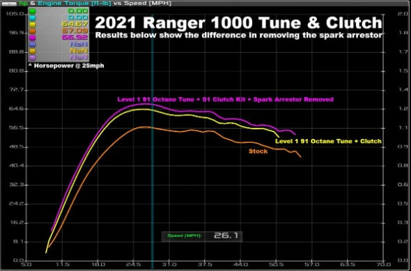 - Get ready, your Ranger 1000 is about to transform! This simple to install lock and load kit delivers big horsepower, wicked acceleration, and a Ranger that feels like an RZR! The factory 80 horsepower Ranger 1000 is very limited from the factory, and we are here to help. The Ranger 1000 motor is essentially the same motor that is in the RZR S 1000, with smaller lift cams. Even with the weaker cams, this motor is still capable of nearly 100 HP on pump fuel. The key to more horsepower on this platform is RPM, which is limited not only in programming but by clutching also. In this tune we remove torque limitations holding back horsepower at higher RPM, extend rev limits, and tune fuel & timing tables for the higher RPM. This combination provides excellent results and the horsepower/speed you are looking for! This Lock & Load kit also includes our primary spring and magnetic adjustable clutch weights. Having adjustable weights is important as no Ranger is the same, and we send you with a guideline to help initially setup your ranger depending on where you ride, tire size, and model. The clutching allows us to rev the motor to 7500-7800 RPM where best power is made and the difference is simply unreal. This simple kit is a must have for those looking for more out of their Ranger 1000!