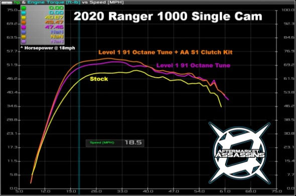 - The factory 61 horsepower Ranger 1000 single cam is very limited from the factory, and we are here to help. The speed limitations at 55 MPH and the torque limits they put in the ECU really hold things back. We unlock full potential and test at higher RPM unlike many competitors. We have had this motor up to 8000 RPM and found best power to be around 6400-6600 RPM. For this reason we include our Stage 1 clutch kit with our Lock & Load kit. Between dyno tuning and data logging in the field we developed a tune that creates max horsepower for this model, and adds a ton of down low to mid range power.