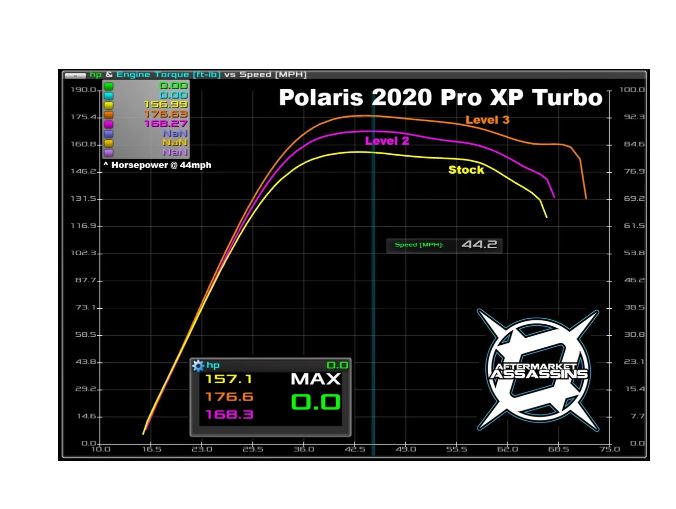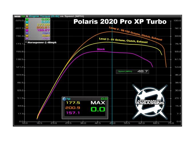 - Level 4 - Beast mode - 200 RWHP! This tune is designed for 98-100 octane (will run on UTV 96, or most fuels up to 110 octane) and was developed using one can of VP Octanium to a tank of fuel. Mixing other race fuel with the tune to get 100 octane output would work great, just keep in mind consistently using leaded fuels can result in premature failure of O2 sensors. Now for the fun part.... this tune is INSANE and brings your Pro XP to a new level at 197-200 RWHP on our dyno. This tune gains 40-43 RWHP and pushes the boost level to 23-24 PSI peak before settling at 22-23 PSI. Keep in mind the Power Vision boost only reads to 22-23 PSI (depending on your altitude) so it will be close to maxing out the gauge. The ECU still has vision above that, but you won't be able to read it without a manual gauge. Required Mods: High flow pre airbox intake tube, exhaust, Charge Tube, Billet BOV, S3 Clutch Kit. Suggested mod: After airbox intake tube WITH catch can, torque head bolts tighter with 120 degrees more rotation. No wastegate adjustment required.